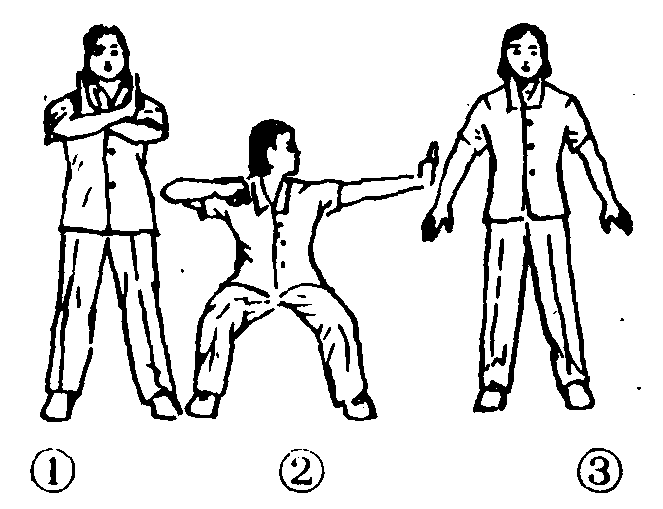 练功十八法第5套第2节。动作过程:两脚并立。❶左脚向左横跨一步,同时两手立掌交叉于胸前。(图2—4—145—❶)❷两腿屈膝成马步,同时左手向左侧立掌推出,右掌半握拳,拳心向下,平屈肘后振。(图2—4—145—❷)❸两手变掌下按,同时两腿伸直。(图2—4—145—❸)❹还原成并立。❺~❽和❶~❹相同,但方向相反。共做4个8拍。注意事项:拉弓时要挺胸,并尽量使肩胛骨靠拢脊柱。此功法对网球肘、手指腱鞘炎有一定疗效。