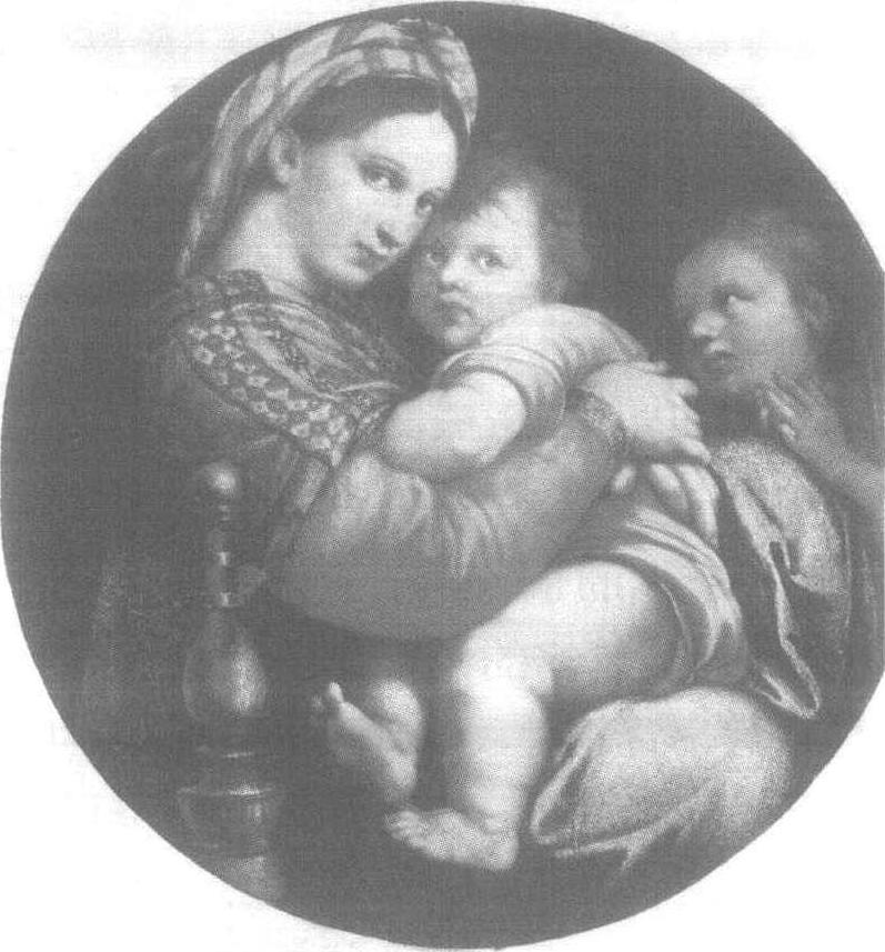 | 释义 | 拉斐尔《椅中圣母》画中的圣母,似乎在以亲切的目光看着我们。她像普通的母亲 一样,把自己的孩子耶稣抱在膝上,静静地用脸颊亲着孩子。孩子睁着圆圆的大眼睛,一面眺望着那遥远的天界,一面甜甜地依偎在母亲的怀中。他身旁的小朋友圣约翰,合起双手作朝拜的动作,敬穆地望着美丽的圣母。