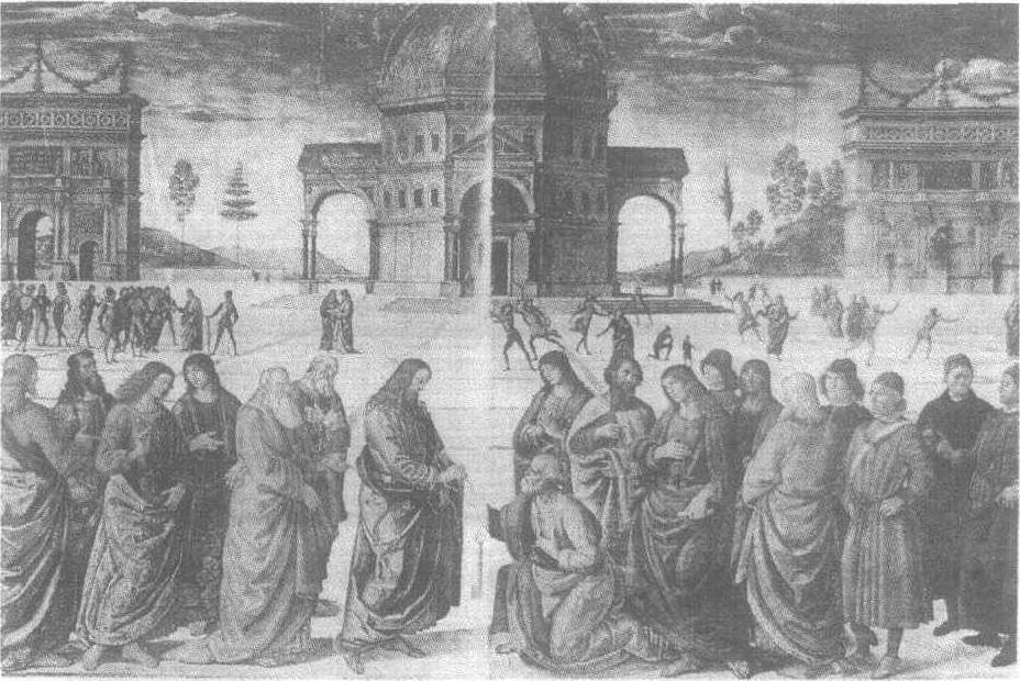 基督把钥匙交给彼得 佩路几诺 这幅画更著名的是它完美的构图。画中的各条曲线互相吻合,就像精密的齿轮一样。从圣母的头开始,通过颈部、肩、臂、肘、腕,形成了一根半圆形的曲线,它贯穿于整个画面。与其相对,小耶稣的肘、背、臀、腿等部位又相互连接,形成了另一条相反方向的半圆曲线,它恰好与前面的曲线相吻合。圣母的左膝高高抬起,虽然这种坐态很不自然,却能让小耶稣稳稳地坐在她的腿上。同时拉斐尔又尽量让她的左膝隐入阴影之中,并提亮前面右膝的色彩。经过这样周密构思组成的画面,给我们留下的是极其自然的印象。 拉斐尔(1483—1520)出生在意大利中部的文化名城乌尔比诺,11岁时失去了父亲,1500年到佩鲁贾市从佩路几诺学画。佩路几诺是位土生土长的画家,他那种在清澄的大气之中渐渐扩展开来的风景画和那种有着圆圆的脸庞、带着甜美表情的人物画,对拉斐尔产生过深刻的影响。 1504年,拉斐尔来到了佛罗伦萨。当时米开朗基罗(1475—1564)刚刚为市政府完成象征推翻暴政的《大卫》雕像,他与达·芬奇正在为获得市议会大厅壁画的制作权而展开竞赛。21岁的拉斐尔很快吸收和融合了这两位前辈的长处,并完成了数幅圣母子像。不久,拉斐尔便动身去了罗马。 |