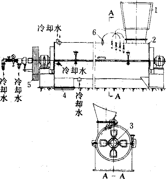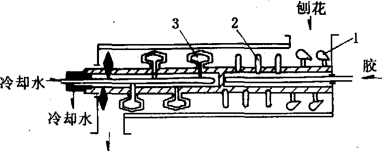 图1 通冷却水的喷雾式连续拌胶机 离心式喷胶拌胶机 喷雾法喷胶是将胶液雾化后喷出,胶粒难免有过大过小现象,从而影响拌胶质量。离心式喷胶拌胶机克服了这一缺点。该机内的搅拌轴是一空心轴,在轴的前端有进料铲,中部有甩胶管,在甩胶管上开有许多甩胶孔,孔径为2.54毫米。轴后端有搅拌桨。空心的搅拌桨旋转时(约1 000转/分)产生的离心力将甩胶管中的胶液以0.1兆帕的工作压力从甩胶管上的小孔中甩出,分布到刨花表面,经过搅拌桨的搅拌,然后从出料口排出。该机结构见图2。 ![]() 图2 离心式喷胶拌胶机 为避免在搅拌过程中胶液受热提前固化,其外壳也设计成夹套式,通冷却水冷却。这种拌胶机的不足之处是清洗甩胶管比较困难。实际上在工作时甩胶管也参与了搅拌,所以甩胶管的磨损和小孔的堵塞在一定程度上影响了该机的寿命和拌胶质量。 高速拌胶机 结构如图3。该机的拌胶部分由4个卧式长圆形的拌胶箱组成.并且互相沟通。每个拌