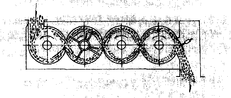 图3 四箱式高速拌胶机 胶箱内都装有一根高速搅拌轴,在第二个拌胶箱内胶液由离心方法从甩胶管中甩出,刨花沾上胶后流入第三、四拌胶箱中,在这里刨花相互摩擦,使胶液在刨花中分布均匀。在拌胶箱的下方设有调节仓,用于贮存和输送拌好胶的刨花。为防止胶液提前固化,调节仓的壳体和搅拌器需用冷水冷却。高速喷头拌胶机 这种拌胶机用一个压力雾化喷嘴喷胶。快速搅拌器使刨花从轴向向上运动,已拌好胶的刨花被运送到外围向上部排出。该机结构较复杂,不易清洗,搅拌效果亦不甚理想。 见刨花拌胶。 |