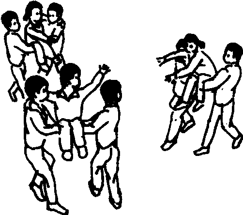 游戏方法 将学生分成若干组,每组3人。预备时,其中两个人互握手腕,形成“井”字。另一名学生坐在“井”字上。然后站在正方形边线上。教师发出开始命令后,各组进入方块内追跑躲闪,坐在手上的学生力争拍到对方坐轿人的背部。被拍者的组即退出场外。 游戏规则 ❶不许互相拉、拽或用意冲撞对方。 ❷抬轿子的学生在游戏中脱手算失败,退出场外。 |