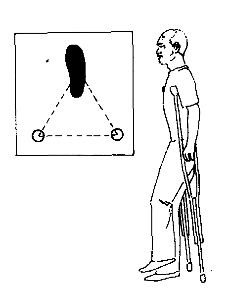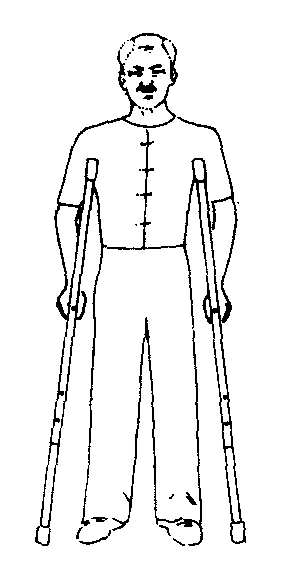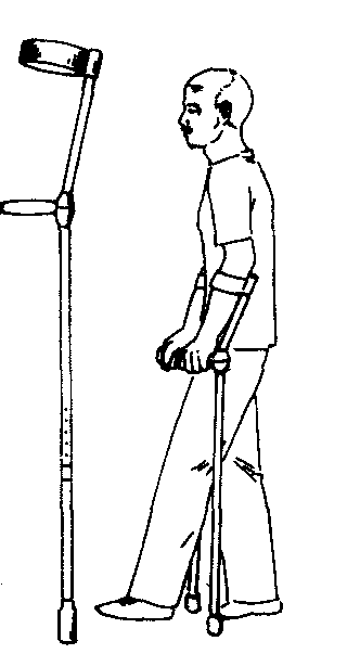 | 释义 | 拐的使用方法拐杖是辅助步行的一种工具,可帮助残疾人行走时增加稳定性,并能减少下肢的承重。常用的拐有长臂拐(腋拐)、短臂拐(前臂拐),其它还有临时拐,轮拐,双杠拐等。最常用的是长臂拐,多选用弹力强质地坚硬的木料和轻金属制成。拐下端装有橡皮套防滑,上端有海绵垫。其长度从腋窝到脚为宜,可根据病人身高调节。过高可使腋下疼痛,过低屈背易感疲劳。拐的把手按病人上肢的长短调节,以屈肘30度为持重力最大。拐可用单拐或双拐,使用单拐时大部分将拐置于健侧,因患肢不能完全负重,而借助拐来增加健侧对整个身体的支撑。当一侧下肢完全不能负重时,必须用双拐。使用双拐行走方法:三点步态,如一侧截肢病人,在行走前先将两拐同时放在健腿前方,然后抬起健侧腿移到两拐的前方,再将两拐同时向前移到健腿前方,如此反复。但注意拐着地的两点和健侧脚着地点永远保持三角形,不能在一直线上以免失重。两拐之间的宽度,以两肩之宽度为宜,行走时两手紧握把手,用两上肢支持体重而不是靠腋窝支撑,否则会压迫腋下神经而导致神经瘫(拐仗瘫)。行走时注意地面不要有水以免滑倒。