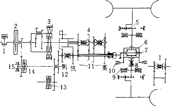 轮式拖拉机传动系统 1.发动机 2. 主离合器 3. 动力换档快/慢 4. 主变速 5. 最终传动 6. 中央传动与差速器 7. 动力输出轴 8.差速锁 9.行车制动器 10.停车制动器 11.组成式变速箱 12.分动箱 13.前桥驱动离合器 14. 动力输出轴离合器 15. 动力输出轴制动器 |