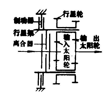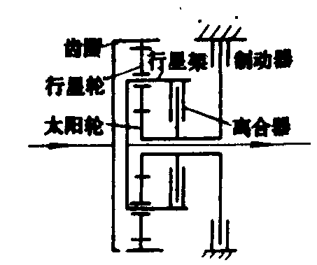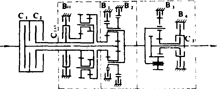 (b)外啮合行星式 图1 两档动力换档机构 两档动力换档 用于部分动力换档的变速箱中,可实现高低档间不停车换档。当负载增大时换入低档;负载减小则换入高档,这样,能使有级变速箱增加1倍的排档数。内啮合行星式动力换档机构[图1(a))在输入件齿圈转动和制动太阳轮时,行星架转动,输出动力,速比大于1。放松制动器,接合离合器,使太阳轮与行星架互锁,此时行星机构成一体转动,速比为1。外啮合行星式动力换档机构[图1(b)],放松制动器,接合离合器,使输入太阳轮与行星架成一体转动时,速比为1。放松离合器,制动行星架,此时行星传动转换成定轴传动,速比大于1。 全动力换档 图2是由3个行星机构串联的全动力换档变速箱,具有15个前进档及4个倒档。欲获得1个档位必须同时接合4个操纵元件,即接合C1、C2中的1个或同时接合C1、C2,接合CLO、BH中的1个;接合B1、B2中的1个(假如C1、C2同时接合,则B1、B2不接合),接合C3、B3、B4中的1个。由于能实现顺序换档,故相邻档位变换只需改变2个操纵元件。