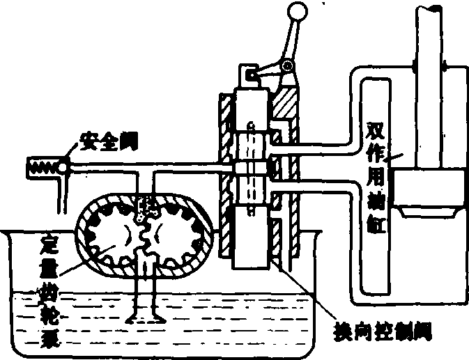 图1 拖拉机液压系统组成 液压泵、液压缸(或液压马达)和阀类元件是液压系统中主要的基本元件(见液压技术)。液压泵将发动机输出的机械能转变为油液的压力能,作为整个液压系统工作的动力源;液压缸(或液压马达)是液压系统中的执行器,它将油液压力能转换成机械能,以完成一定的工作任务;各种阀类元件则按照不同工作要求用来控制或调节油液在系统中的流动方向、流量和压力。此外,如油管、接头、油箱、滤油器、冷却器和蓄能器等则是保证液压系统正常工作所必需的辅助元件。系统中所用油液的粘温特性、抗泡沫性能以及使用中的清洁程度对液压系统的正常工作和使用寿命有很大的影响(见液压油)。 类型 按照拖拉机液压系统的油液循环的线路以及压力和流量的控制等可分为开心式和闭心式两种。 开心式液压系统 采用定量泵,保持一定排量油液的输出,当控制阀处于中立位置,执行元件(液压缸或液压马达)停止工作时,液压泵所供油液经控制阀直接流回油箱,液压泵处于卸荷状态;当控制阀使油液推动执行元件进行工作时,液压系统压力随工作负载而变化,最高压力受安全阀限制(图2)。该系统结构简单,适用于简单功能的液压系统,广泛应用在中小功率拖拉机上。当液压系统要求应用两个独立操纵的执行元件时,系统需要额外附加流量分配阀或特殊的控制阀。随系统功能的增多,执行元件数增加,液压系统将更为复杂,或需分为两个以上开心式液压系统,例如液压转向系统与液压提升、液压输出系统分开。