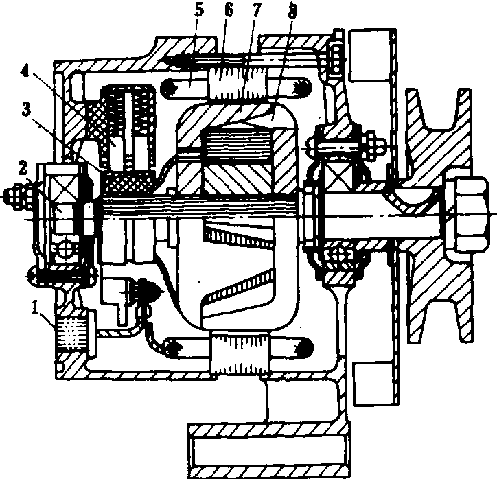 图1 硅整流发电机 1.硅二极管;2.轴;3.集电环;4.电刷;5.定子线圈;6.定子;7.磁极;8.激磁线圈 启动电动机 是一种串激或复激的直流电动机。工作时电磁铁使其驱动齿轮与发动机飞轮齿圈啮合而启动发动机。当发动机启动后转速升高,单向离合器使驱动齿轮在轴上空转退出啮合。为了减小体积适合小缸径发动机配套,采用带有减速装置的高速启动电动机。