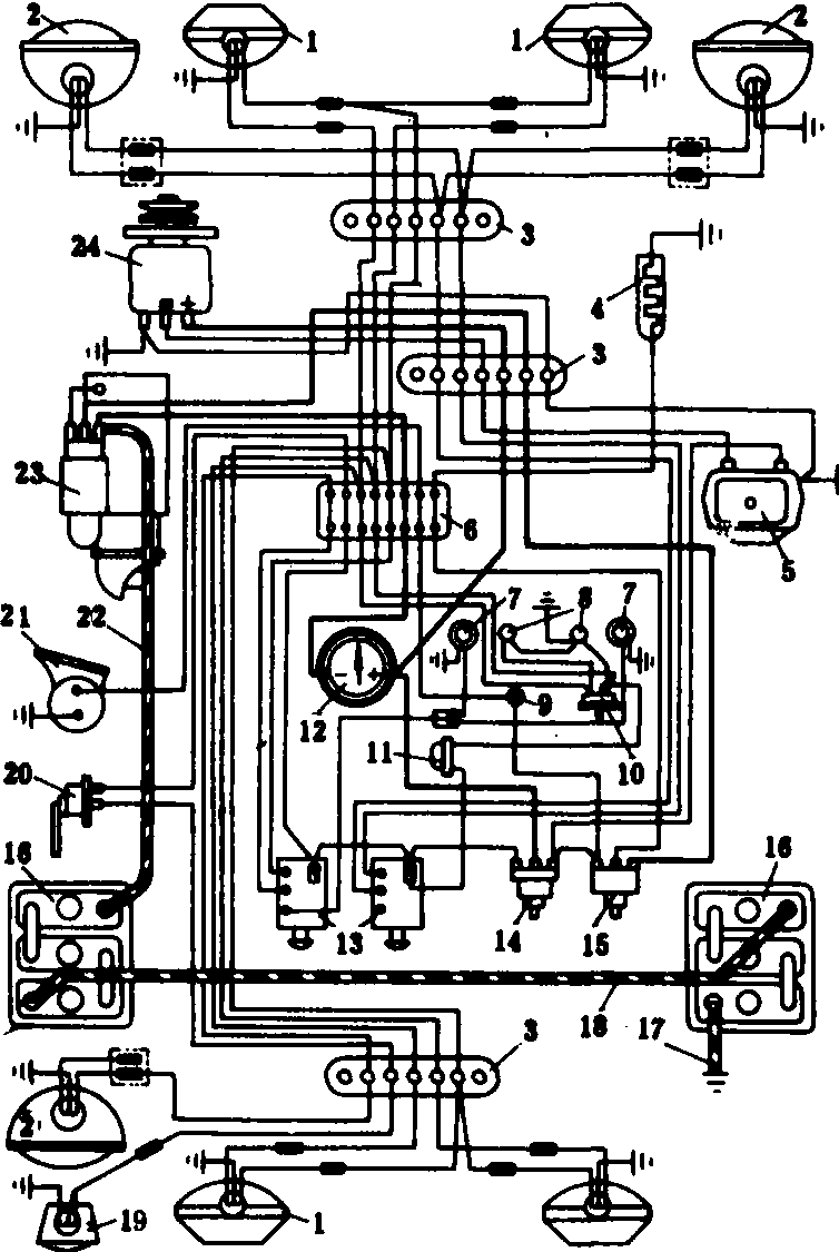 图2 拖拉机电器线路 1.小灯; 2.大灯; 3.接线板; 4.预热塞; 5.调节器;6.保险丝盒; 7.仪表灯; 8.转向信号灯; 9.喇叭按钮;10.转向灯开关; 11.闪烁断续器; 12.电流表; 13.双档开关; 14.电门开关; 15.预热启动开关; 16.蓄电池; 17.蓄电池搭铁线; 18.蓄电池间连线; 19.刹车灯; 20.刹车灯开关; 21.喇叭; 22.蓄电池至启动机连线; 23.串激式直流电动机; 24.硅整流发电机 照明系统 拖拉机一般有前灯、转向灯、刹车灯、仪表灯、工作灯等。各灯具在照明区的照度都有一定要求。有的拖拉机尚有慢速车辆警告灯、尾灯、示廓灯、驾驶室顶灯等。 仪表及信号报警系统 由指示仪表、闪光灯、信号灯及传感器等组成。常用的仪表有水温表、机油压力表、电流表、速度表、燃油油量表、工作小时计等。仪表的型式有弹簧管式、热电式、磁电式等。现代拖拉机常采用磁电式组合仪表,配温度、压力、真空度、转速、油量等各种传感器。传感器的结构有模拟量类和开关量类两种,模拟量类传感器和指示仪表相配;开关量类传感器与报警信号灯配合,作超限报警。开关量类传感器常用于油压及空气滤清器堵塞,机油和柴油滤清器堵塞等。闪光灯用来提供转向和报警信号。还有一些信号灯用来指示拖拉机工作状况,如停车制动器是否放松;前轮驱动是否挂档;蓄电池是否充电;动力输出轴转速是540转/分还是1 000转/分,以及挂车转向灯的使用。 拖拉机转速表有机械传动式和电子式两种,电子转速表实际上是一个广角毫安表,电磁转速传感器发生脉冲信号,经电路变换为正比于转速的电流信号送入毫安表。在转速表上常常标注行驶速度和动力输出轴转速。这种表没有传动机械磨损,因而获得广泛应用。工作小时计累计拖拉机工作时间,一般安装在转速表内。 随着电子技术的发展,在一些现代大功率拖拉机上已装有微处理机的仪表及检测系统,具有数字显示、闪光报警、音响报警以及自动检测的功能,以减轻驾驶员的劳动。 图2是一种典型拖拉机的电器线路原理图,除电流表以外,其余的仪表及传感器未画出。 拖拉机电器仪表系统electrical instrument system of tractor拖拉机的重要组成部分之一。由电源、用电设备、配电部分及点火系统等组成。电源分交、直流两类。前者为交流发电机;后者由直流发电机或硅整流发电机、蓄电池及调节器等组成。用电设备包括起动电动机、照明设备、电喇叭、电器仪表(水温表、油温表、油压表、电流表等)及指示信号等。配电部分包括开关、保险装置和导线等。点火系统有蓄电池点火和磁电机点火两类。前者由点火线圈、配电盘及火花塞等组成;后者由火花塞及磁电机等组成。 |