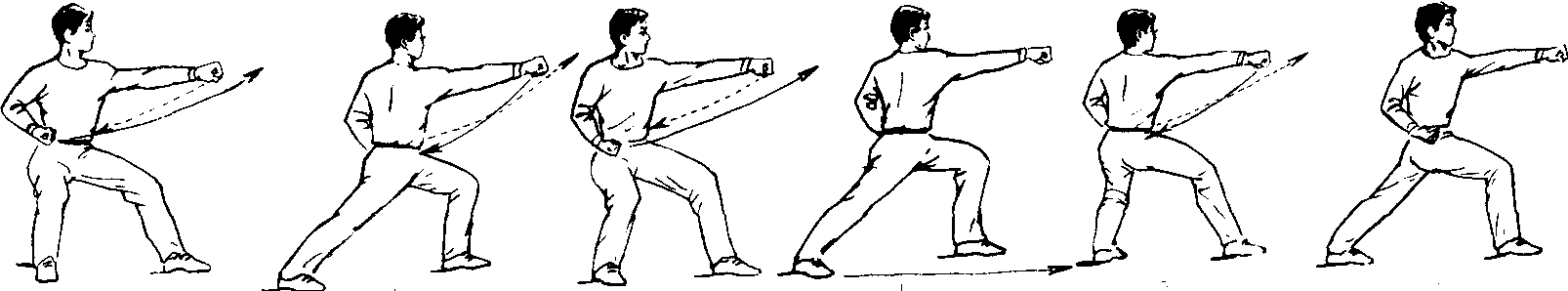 | 释义 | 拗弓步冲拳又称拗步冲拳。长拳基本动作之一。是长拳手型、手法和步型、步法配合的典型动作。以左弓步右冲拳为例。预备式:站成左半马步。左手握拳直臂伸出成平拳;右臂屈肘,右手握拳置于右腰间,拳心向上,目视前方。冲拳时,右腿蹬地伸直,左腿屈膝成左弓步,同时上体向左拧转,右拳由腰间向前冲出成平拳,左拳屈臂回收至左腰间,拳心向上,目视前方。动作要领:冲拳时要蹬地,合胯,拧腰,顶头,顺肩和快速旋臂,使力量直达拳端。教学重点:❶强调拗弓步冲拳姿势的规格,可用此动作站桩来“定型”。