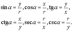 给定一个任意角α,以角α的顶点为原点,始边为X轴的正半轴,建立直角坐标系(如图).设任意角α的终边上任意一点P的坐标是(x,y),它与原点的距离是r(r= ),则比y/r,x/r,y/x,x/y,r/x,r/y分别叫做角α的正弦、余弦、正切、余切、正割和余割,记