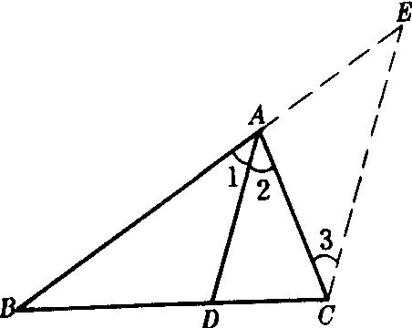 证明:如图所示,作CE∥DA交BA延长线于E,∠E=∠1=∠2=∠3,所以AE=AC.由平行线