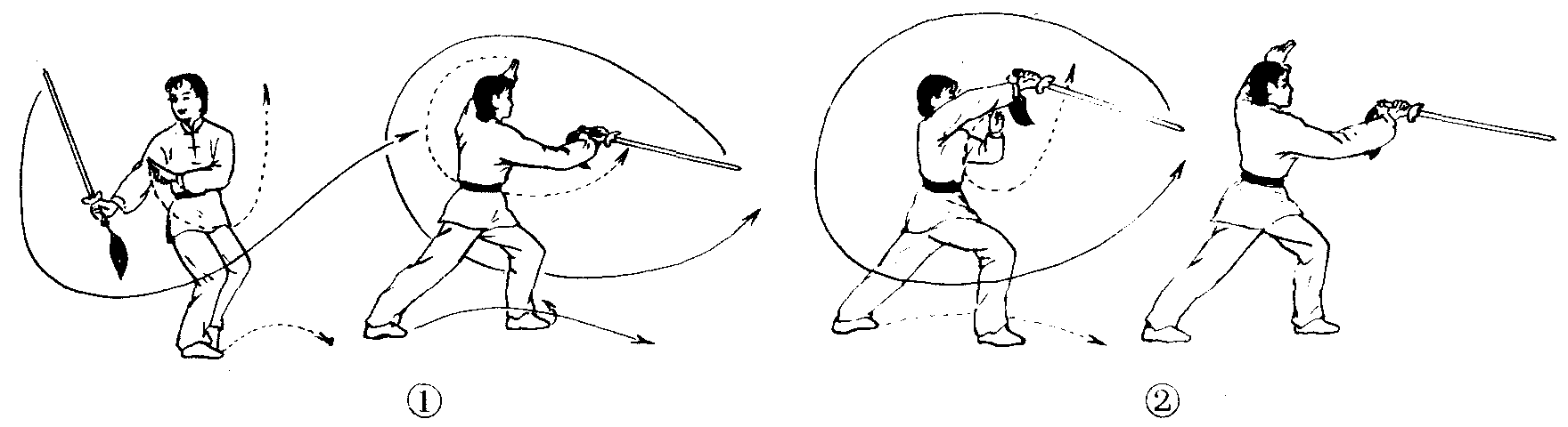 剑法之一。是以剑身的下刃为力点,由下斜向前上方带剑的动作。拦剑多在太极剑中出现,现代竞赛套路中出现得较少。动作过程:拦剑有持剑之前臂外旋,手心斜向上,贴身体右侧划弧,绕至左肩前,剑尖斜向右前下的左拦剑(图2—4—109—❶)和持剑前臂内旋,手心斜向下,贴身体左侧划弧,绕至右肩前,剑尖斜向左前下的右拦剑(图2—4—109—❷)等形式。动作要领:拦剑时要求:❶发力于腰臂,力达剑身下刃。❷剑尖斜向下。❸剑身与头同高。❹成立剑。❺多用螺把和刁把握剑。攻防含义:拦剑是攻防兼用型剑法。其特点是防中寓攻。可用于攻击对方胸、肘、肩等部位。具体用法是对方剑攻来时,用剑拦击对方的剑,或用避开对方的剑,攻击对方的腕、肘、肩等部位来防守。注意事项:老年初学者做拦剑时应注意:❶拦剑与撩剑的区别(见撩剑)。❷拦剑时手腕没有动作。❸拦剑之前先做立圆摆动。