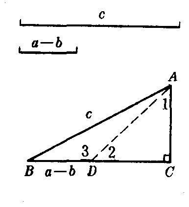 例如,已知直角三角形的斜边及两直角边的差,求作这个直角三角形. 已知 直角三角形的斜边长为c,两直角边的差为a-b. 求作 直角三角形. 分析 如图,若△ABC为所求的三角形.∠C=90°,AB=c,BC-AC=a-b.在BC=a上截取CD=b.连结AD.因为∠1=∠2=45°,所以∠3=135°.在△ABD中,因为AB,BD,∠3已知,所以这个三角形可作.在此基础上,便可作出△ABC. 作法 ❶作△ABD,使AB=c,BD=a-b,∠ADB=135°; ❷过A作BD的垂线,交BD的延长线于C.则△ABC就是所求的三角形. 讨论 当c≤a-b时无解,否则有一解. 证明 略. |