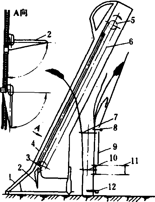 图4 铅垂面型扶禾器的结构 1. 分禾器; 2. 拨指; 3. 下链轮;4. 链盒(拨指导轨); 5. 上链轮;6.扶禾链; 7.上拨禾星轮; 8.上横向输送带; 9.挡板; 10.下拨禾星轮;11.下横向输送链; 12.切割器 倾斜面型扶禾器 主要特点是拨指在扶禾链回转平面内运动,工作比较平稳。它相邻两链盒形成的无拨指区b1[图3(b)]较宽,约400毫米左右,作物在此处发生较大横向倾斜的状态下被切断,对窄行距或矮秆作物会产生高割茬或漏割等现象。 |
