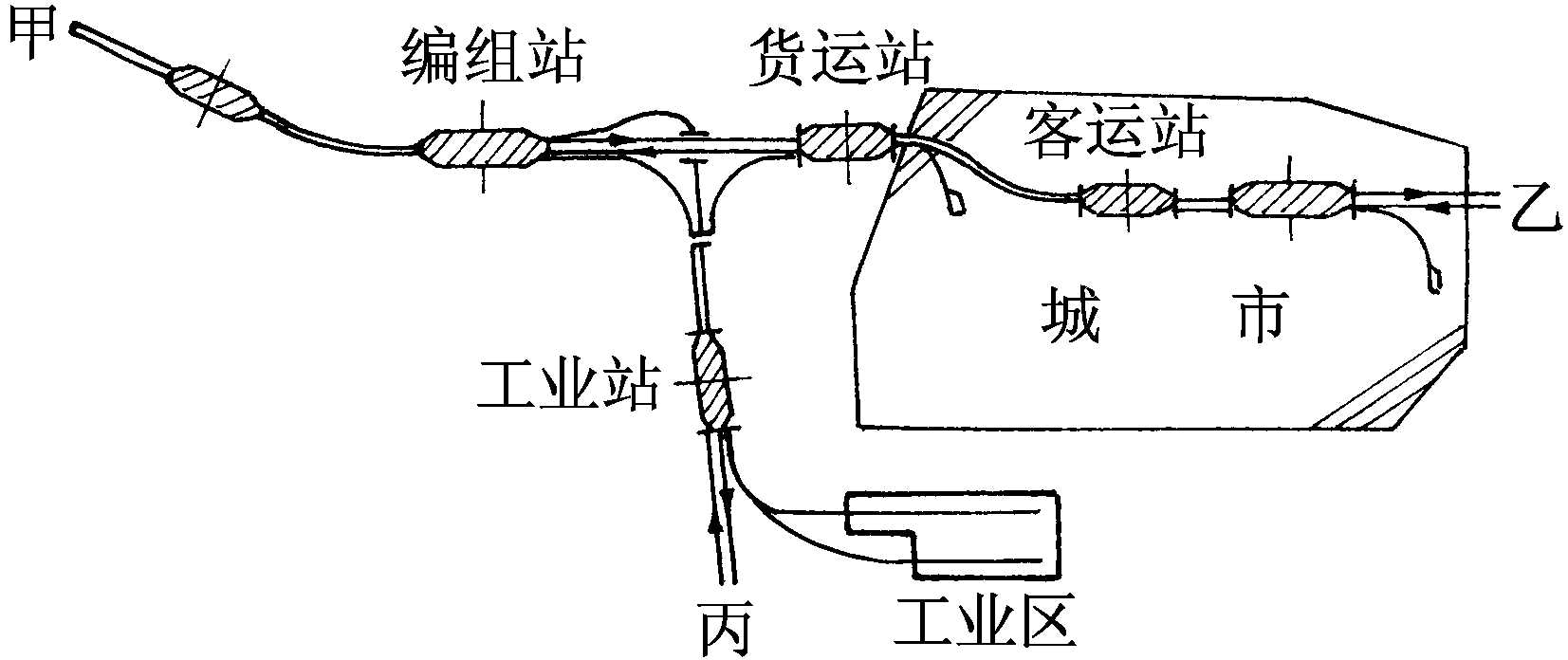 | 释义 | 三角形枢纽triangular junction-terminal铁路干线汇集为3个方向引入,干线之间因有较大量的交换车流而修建联络线使之沟通而形成的铁路枢纽。此种布局多呈现三角形结构,故名。枢纽内可根据车流量和车流方向,结合城市规划和铁路网规划的需要,在适当位置分别设置客运站、编组站、货运站等主要专业车站和其他中间分界点。当枢纽所在地有3~4个方向的铁路线路引入,其间有较大量交换车流时,可以此种图形作为铁路枢纽规划的参考。