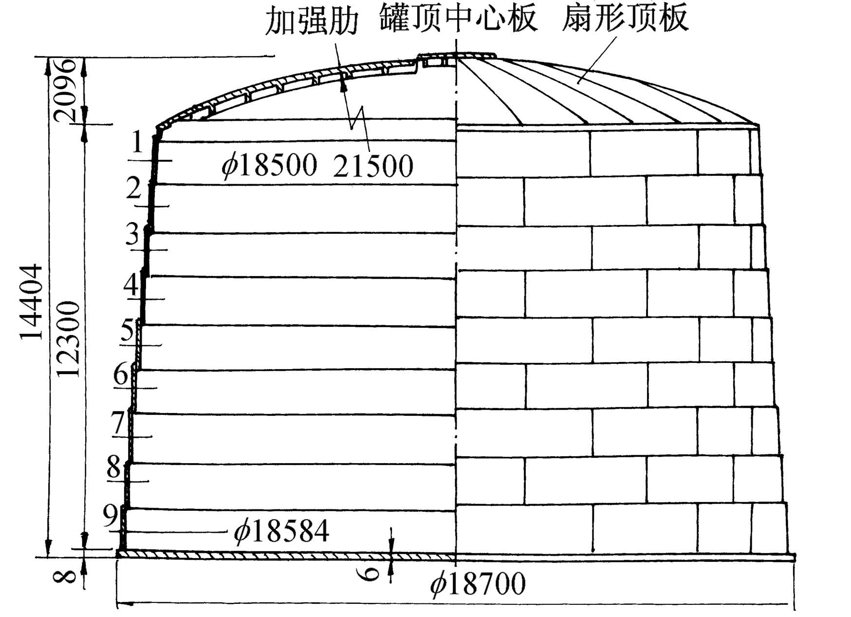 | 释义 | 拱顶油罐dome roof tank罐顶为球缺形的“立式圆柱形油罐”。罐顶由中心板、扇形顶板和壁板的角钢加强环组成。顶板厚度常为4~6mm。油罐直径大于15m时,顶板内侧焊有肋板,以提高顶的稳定性。最大装油高度不宜超过加强环,否则拱脚处受力情况恶化,降低油罐的使用寿命。储油罐容量和直径过大时,拱顶矢高增加,使单位储油量耗用钢材增多。一般认为:拱顶油罐最经济的罐容为10000m3。拱顶油罐内存在气体空间,由于环境温度变化和油罐的装卸作业,罐内气体忽而膨胀忽而被压缩,必须通过呼吸阀自动泄放油蒸气或吸入空气,使罐内压力保持在油罐承压范围内(参见“立式圆柱形油罐”),这样就造成油品的蒸发损耗,可采用消除气体空间的浮顶油罐减少油品损耗。