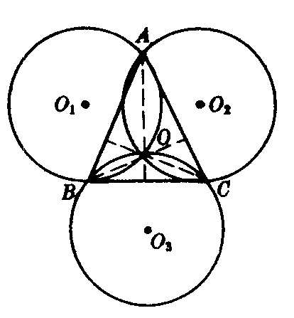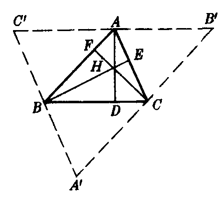 三角形三条高线或其延长线的交点.三角形有且只有一个垂心.锐角三角形的垂心在形内,直角三角形的垂心就是直角顶点,钝角三角形的垂心在形外.若四个点中一个点是其余三个点所连成的三角形的垂心,则其余三个点也有同样性质.如图1,H是△ABC的垂心,A是△HBC的垂心,B是△HAC的垂心,C是△HAB的垂心.具有以上性质的四个点叫做垂心组.若三个等圆交于一点,则这点和其他三个交点必构成一垂心组,如图2.