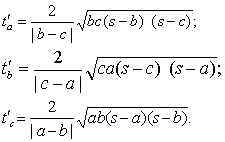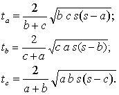 | 释义 | 三角形的角平分线长公式sanjiaoxing de jiao pingfenxi-an chang gongshi设ta,tb,tc分别表示三角形三个内角A,B,C的平分线长,a,b,c表示三边长,s=(a+b+c)/2. 则