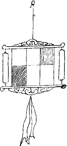 将不同颜色的小方镜组在一起,下系一块红布,两边圆柱为黄色、表示专售各种镜子。