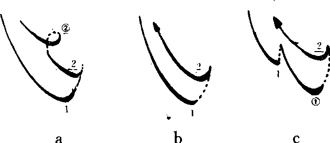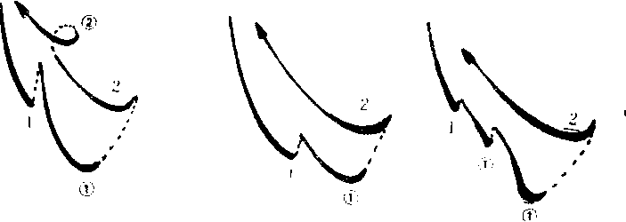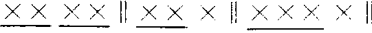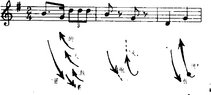 从以上图式中可见,C、b第二拍为两个八分音符,如用一般图式击拍,××节奏就显示不出来,必须要在挥拍线条上打出一个细分来,才能表现出两个八分音符的节奏。 这种细分法也同样可用于附点音符与十六分音符。如: