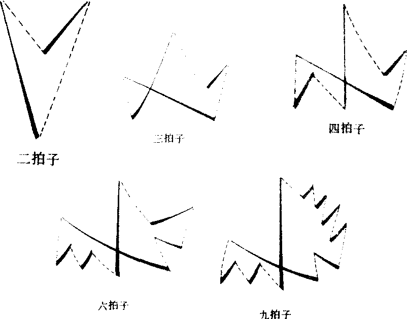 | 释义 | 指挥的姿势和基本动作指挥的姿势要求自然松弛,舒展大方。双脚微分开站立,两眼环视合唱队,手微拱做抓物状,掌心向前下方,双手在胸前约20cm处,以手、腕、小臂、大臂、肘关节的循环往复运动,组成指挥的基本动作。指挥的动作原则要求准确、精练和美观。基本动作包括:击拍、起拍和收拍,保持动作和动作的简化、细分等。击拍的动作由下垂、上举、斜行3个方向的线条组成,往返动作之间形成夹角,角的顶点为击拍点,点前动作具有击发力的主动感,反弹动作具有弹起后松弛的被动感。以二拍子为例的图示:击拍点以手掌靠近手腕的部分击出,是一拍的真正开始处,演唱(奏)的整齐与否,关键在此。常用的击拍法如图示(以右手为例):起拍分为“预备”、“吸