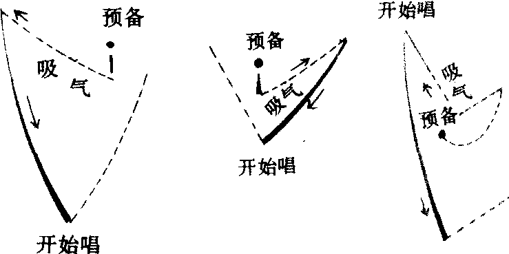 ❷吸气:双手原地弹起,击出吸气拍。吸气拍应体现歌曲开始部分的速度、力度、感情。 ❸开始唱:吸气拍后明确果断地打出击拍点,歌声在这里开始。3个步骤有节奏地连贯进行,吸气拍是关键,自吸气至开始唱的击拍点之间,为不吸不呼阶段,这时歌者声带靠拢,想着音高、力