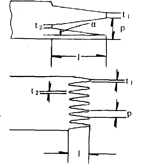 图4 刀 具 影响指接性能因素 主要因素除木材含水率、胶合剂和材料加工精度外,还有指齿形状和胶合压力。❶指齿形状(图1)。试验表明,指齿参数选择下述范围值为宜:指接斜率a为1/7~1/10;齿长1=3p(p为齿距),一般采用6~20毫米, 而欧美一些国家采用4~60毫米;齿顶宽t1, N型齿t1=(0.2~0.4)p,微型齿t1=(0.1~0.15)p;嵌合度t1~t2为0.13~0.27。 ❷胶合压力如下表: 指接加压范围值