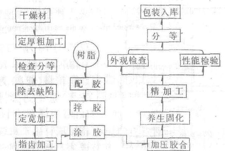 图2 H型齿与V型齿 生产工艺及其设备 指接成材生产工艺与被加工材料的性状(原木、间伐材、短小材等)有关,其设备也略有不同。尤其在胶合工艺及设备方面,差异较大。在胶合工艺方面有冷压、热压、高频胶合、射频胶合等方法,但常用的是冷压法,其工艺流程如下: