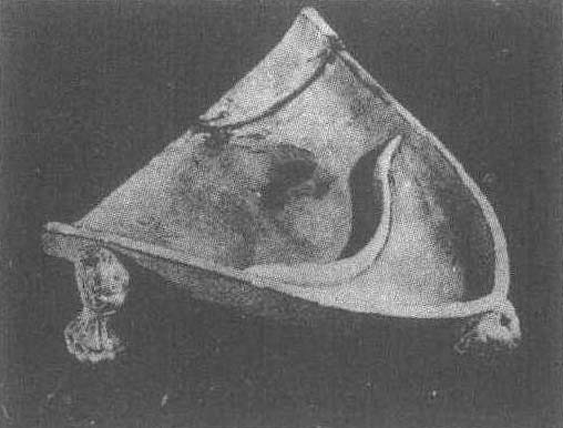 唐。长20厘米,宽20厘米,高5.7厘米。天津市艺术博物馆藏。陶砚是用极细腻的陶土装模烧制而成,纹理精细滑润,赤红染体,色润。砚作三角箕形,砚池呈凸突,中有一月牙栏与砚堂分隔,“一”字形萁口一角有磕伤,后修复粘合。砚足呈兽头状。