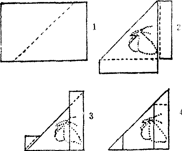暂时收藏、保存昆虫的扁三角形纸包。在远途采集昆虫时,因受设备和时间的限制,不能立刻将昆虫制成永久标本,可依据昆虫的大小和干燥程度,用透明油纸、玻璃纸、厚毛边纸或报纸等折成三角形的纸包,暂时收藏保存起来。三角纸包适于放入蝴蝶、蛾、蜻蜓等翅发达和含水较少的小型昆虫。一般用16开的长方形纸裁成4块,长宽近于3:2即可够用。折叠的方法较为简单,可分5步进行,参照图上所注1~4的顺序,即可折成个纸袋,所以,三角形纸包又称“三角形纸袋”。包内最适放入1个标本,小型昆虫可放入数个,但限同时同地所采标本,包外应注明各项采集记载。