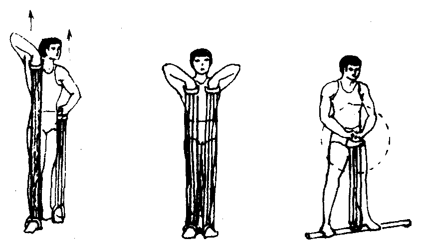 ❶单臂轮换上提:上体直立,单脚踏住握把,两手各握住一个弹性物体,两臂轮换用力上提至肩部。(如图2—3—101)❷立正提肘拉:上体直立,单脚踏住握把,两臂同时上拉弹性物体至上胸部位。(如图2—3—101)❸圆周拉引:上体直立,两臂将固定在小腹的弹性物体沿顺时针(或逆时针)方向拉引。(如图2—3—101)❹直臂前上振:背对肋木站立,两臂伸直前上振。❺直臂胸前侧平举:伸直的两臂向侧上提举弹性物体至两肩平行,做动作时身体直立,弹性物体不能触及身体。弹性物体最好放在胸前做。