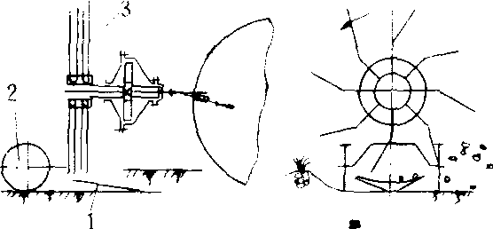 挖薯机 1.挖掘铲 2. 限深轮 3. 抛掷器 |