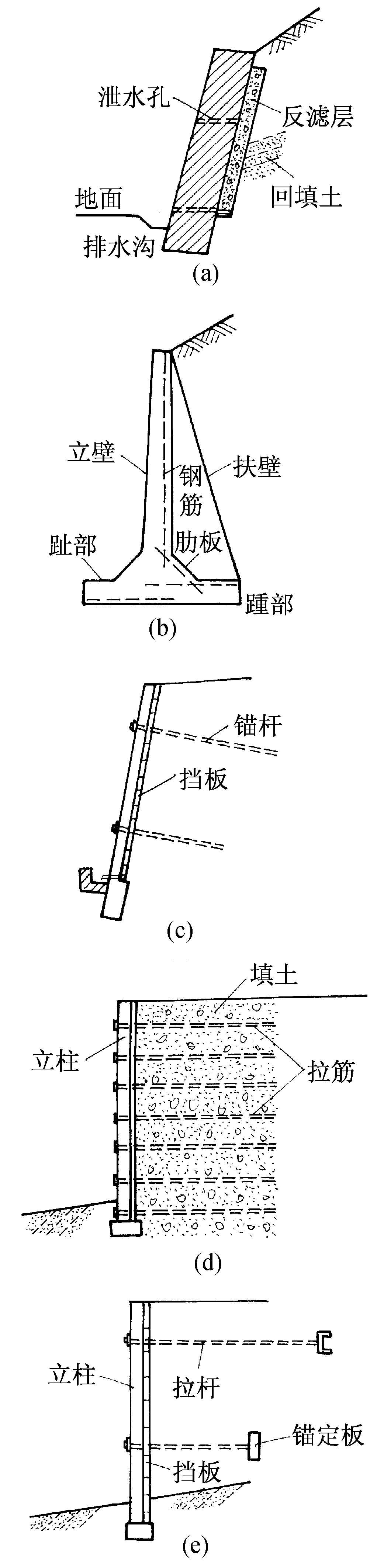 | 释义 | 挡土墙支承土层压力,防止土坡坍塌的结构物。用于两侧地面有高差的情况。常用砖、石、钢筋混凝土等建成。 挡土墙retaining wall用于支挡陡坡路堤或山体边坡的建筑物。挡土墙的种类甚多,有重力式,悬臂式,锚杆式,加筋土和多层锚定板式等。重力式挡土墙(图a)完全依靠墙体本身的重量来抵抗墙后的土压力以保证其稳定,用片石或混凝土筑成,结构简单,应用极为广泛。但在地基软弱或墙身较高、土压力较大的情况下,不宜修筑。悬臂式挡土墙(图b)由立壁、趾部和踵部三个悬臂组成,用钢筋混凝土筑成。当墙身较高时,沿墙身一定距离上加建一道扶壁和踵部连接形成扶壁式挡土墙。锚杆式挡土墙(图c)的墙面由钢筋混凝土立柱和挡板构成。立柱用锚入稳固地层中的锚杆拉住,立柱间安装挡板。加筋土挡土墙(图d)为20世纪60年代新出现的形式,它依靠拉筋与填土间相互摩擦力使墙身稳定。锚定板式挡土墙(图e)依靠填土中的多层锚定板的抗拔力来保持墙身稳定。后三种形式的结构轻型,适用于机械化施工。