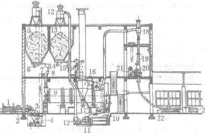 1.木材废料; 2.皮带运输机; 3.削片机; 4.气流运输设备; 5.料仓; 6.振动出料槽; 7.电磁分离辊; 8.刨片机; 9.刨花干燥机; 10.振动筛选机; 11.锤式再碎机; 12.气流运输设备; 13.干刨花料仓; 14.振动出料槽; 15.拌胶机; 16.料仓; 17.振动出料槽; 18.气流运输设备; 19.冲压棒; 20.奥卡尔挤压机; 21.挤压机