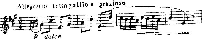 ❹很快的快板。原作是为钢琴四手联弹的乐曲,后经由汉斯·西特改为管弦乐曲。其中《挪威舞曲》第二首经常作为钢琴独奏曲目,也是他同类体裁中最著名的一首小品。这首挪威舞曲是平静优美的小快板,A大调,2/4拍子,单三部曲式。它取自“哈林格”(Halling)一种具有装饰音符特色的轻快舞曲。第一部分是由3个方整性、稍有对比的乐句组成的乐段。它描绘出宫廷优美、娇媚的舞景。在惯用的舞曲织体的伴奏下,呈现出一个优美抒情、典雅细腻的旋律: