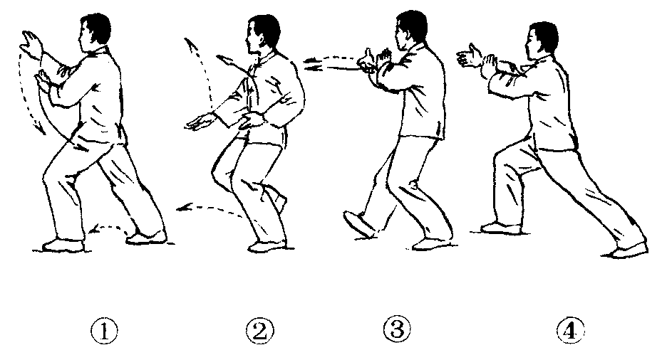 ❹其他要求与“捋”和“挤”要求相同(见揽雀尾)。攻防含义:当对方的手攻来时,用两手粘住其腕肘,顺其进攻之势,经体侧向后捋带,使对方失去平衡而受制,若对方回收,则趁势进步以臂挤发对方。注意事项: