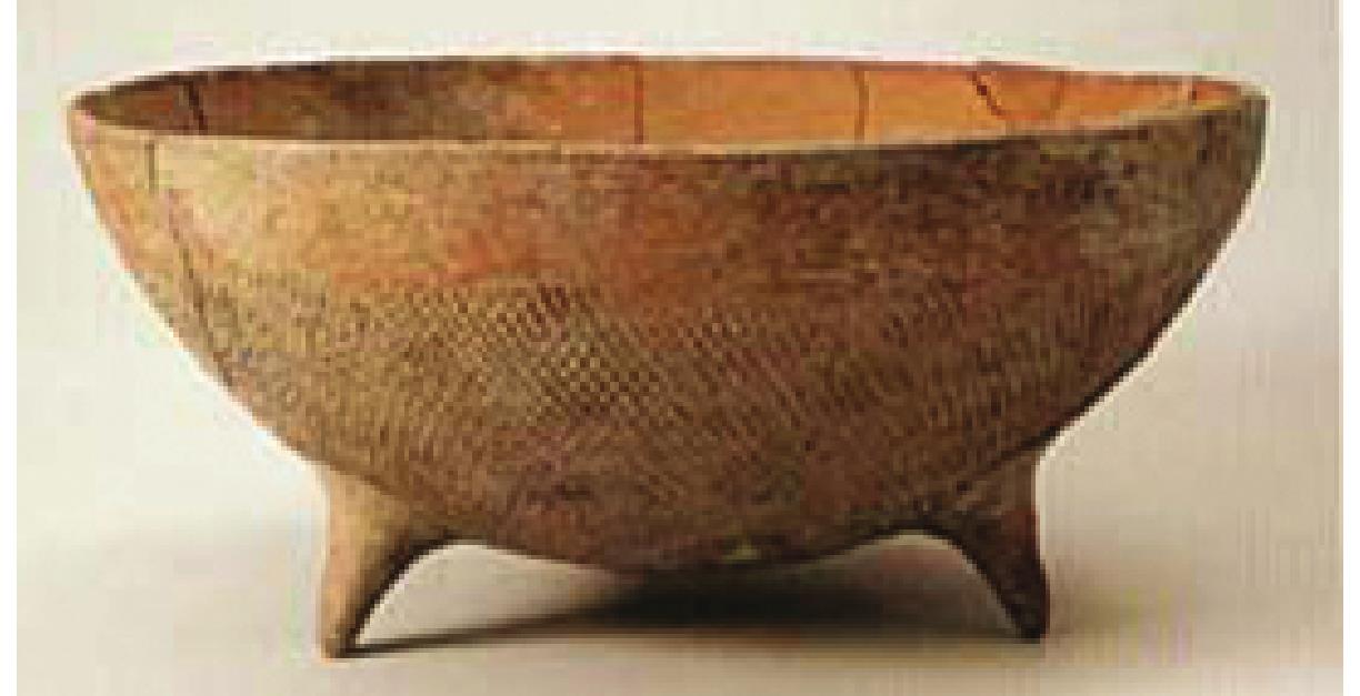 陶器。1979 年于秦安县大地湾遗址出土,高 12 厘米,口径 27.5 厘米。是大地湾文化的典型陶器,兼有食器和炊器的功能。从腹到底部满施交叉绳纹,体口沿外侧周圈抹光,上面绘红色宽带纹,口沿内涂一圈红色窄线纹,彩绘纹样简单,是中国迄今所知最早的彩陶。