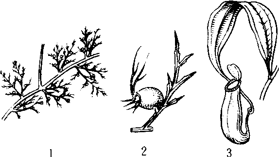 捕虫叶 1.狸藻植物体的一部分,细裂叶的基部生有捕虫器 2. 狸藻捕虫器放大 3. 猪笼草的捕虫叶 |