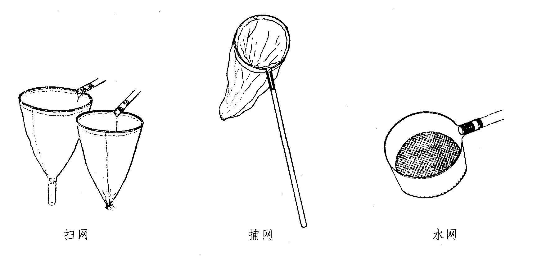 水网 是用以在河流、小溪、湖泊等水域中采集水生昆虫的捕虫网。用吸水性能差、涨缩小,耐腐蚀的材料制作。 捕虫网用来捕捉飞行迅速、善于跳跃或在水中游动昆虫的网的通称。采集时可根据不同昆虫的习性和生活环境,而使用不同的捕虫网。捕虫网一般可区分为捕网、扫网和水网3种类型。捕网:又称“气网”。适于迎头捕捉或从旁掠取空中或地面快速飞行昆虫的网。一般捕网是由网圈、网柄和网身3部分组成。扫网:用于边走边扫捕乱草丛中或小灌木林中的多种小昆虫的网。水网:适于在淡水水域中的水面、水中或水底捕捉水生昆虫和蜻蜓、蜉游稚虫的网。网身可用铁纱、钢纱、马尾、尼龙纱或亚麻布制成,但以不易生锈、漏水快为宜。