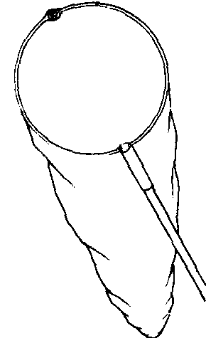 扫网 专用于扫捕栖息隐藏在禾苗、杂草、树丛中、体型小而不善活动昆虫的捕虫网,也用于采集弹跳能力较强和寄生性昆虫。扫网网袋系用结实布料作成,底部常呈开口式,扫捕时将网底口扎紧,扫入昆虫后将扎口解开,直接将网底中昆虫漏入酒精瓶或毒瓶中。如将底口处缝上松紧带,用时套上透明软塑料瓶,则可依据换瓶时间及扫网次数作种群密度调查(图2)。