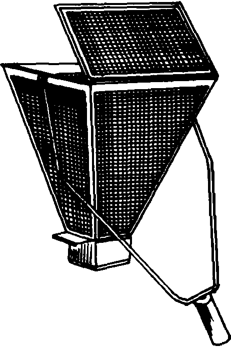 铁纱收捕器 捕蜂器swarm catcher收捕分蜂团的器具。有竹编收蜂笼、铁纱捕蜂器和真空吸蜂器等多种。竹编收蜂笼呈钟形,直径250 mm,高320 mm,內外由竹篾编织,中夹棕皮;收蜂时将竹笼紧靠蜂团上方,用蜂刷驱蜂入笼,将收捕的蜂团抖入蜂箱。铁纱捕蜂器呈倒四棱锥台形,器顶有活盖,器底有抽板;收蜂时打开捕蜂器活盖置于蜂团下方,将蜂团抖入器中,然后盖上活盖;蜂团过箱时,拉开底抽板,抖蜂入箱。真空吸蜂器由抽气装置、真空箱、蜂笼、输气管和吸蜂管构成;收蜂时抽气装置不断抽出真空箱中的空气,使箱内保持一定负压,从而使吸蜂管保持在吸气状态,当吸蜂管的吸蜂口靠近分蜂团时,蜜蜂就会被吸入吸蜂管,并顺管吸进置于真空箱中的蜂笼中;蜂团过箱时从真空箱中提出蜂笼,置于蜂箱的继箱中,然后抽出蜂笼底部的活底板,让蜂团自行转移至巢箱的巢脾上,最后撤下继箱和蜂笼。 |