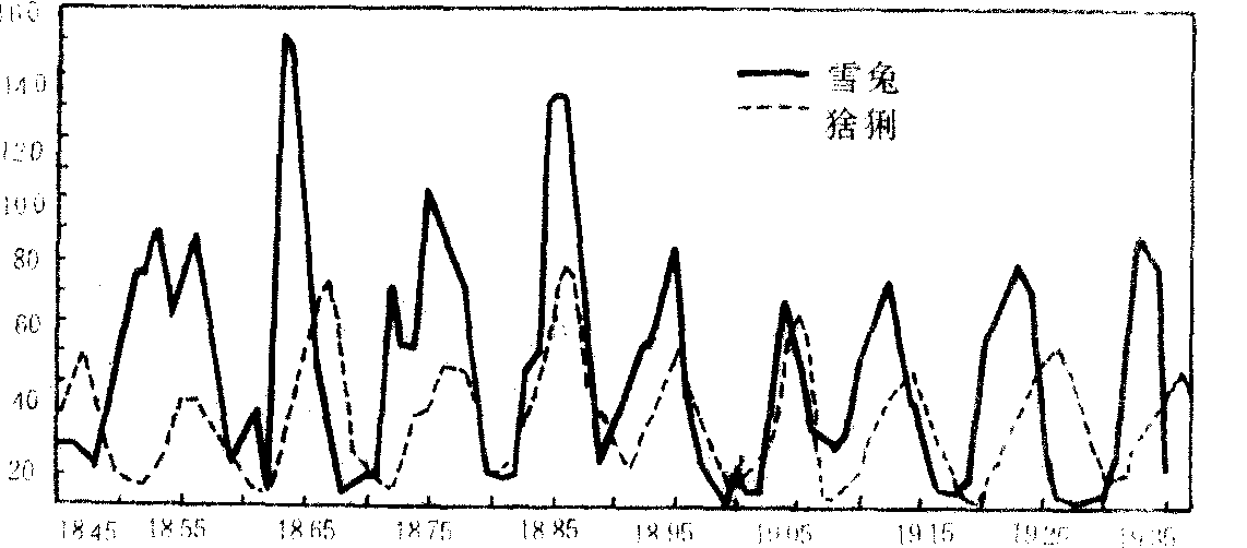 图615 雪兔和猞猁数量的周期性变动 它是群落中生物之间最常见、最基本的相互关系之一。食草动物直接吃植物。有的动物捕捉另一种动物为食,前者称为捕食者,后者为被捕食者。捕食者常位于食物链和营养级的较高位置或顶位,它们的存在常使群落中的物质和能量流通渠道变得多样化,使生物间的关系变得错综复杂。在漫长的进化过程中,捕食者和被食者在形态、生理和行为等方面都产生了一系列的相互适应。如有的捕食者犬齿发达,爪子锐利,动作敏捷,有独特的捕食技巧。而被捕食者也有保护性的适应,如牛、羊有角,羚羊、斑马能快速奔跑,龟、鳖有坚硬的外壳,乌贼有墨囊。但一切防卫都只有相对的意义。捕食者与被捕食者在种群数量上关系很复杂。一般来说,被捕食者数量多时,由于食物丰富,捕食者的数量随之而增加,但这种增加最终必然导致被捕食者数量下降。上述相互作用常使许多捕食者——被捕食者种群出现周期性的数量波动规律,捕食者的数量高峰总出现在被捕食者数量高峰之后。如北方针叶林中的猞猁和雪兔的数量,就是按照大约每10年一个周期的规律而变动的,寒荒漠地带的北极狐和旅鼠则出现3~4年的周期性振荡。在昆虫中,捕食者对被捕食者的种群数量有很强的控制作用,一旦天敌减少,害虫就可能大发生,故常利用引进天敌的方法控制害虫。如引进澳洲瓢虫,控制危害木麻黄的吹棉介壳虫,用寄生蜂抑制危害水稻的黑尾叶蝉,都取得满意的效果。在脊椎动物中,上述控制作用并不明显。如为了保护雷鸟,挪威政府曾鼓励消灭猛禽和北极狐,但去除天敌后,雷鸟种群数量先是上升,后来,由于传染病蔓延而使其种群数量急剧下降。原来被天敌捕杀的多系年老体弱或有病的个体,对整个雷鸟种群来说,淘汰病弱个体反而对控制种群数量、提高种群体质有利。捕食者有时还影响被捕食者的寿命,如在没有捕食者的情况下,田鼠一般可活3~5年,但在自然界中,田鼠的寿命很少超过1年。捕食predation一种生物取食另一种生物,以获得营养而维持生活的现象。前者称捕食者(predator),后者称猎物(prey)。捕食有广义和狭义两种解释。狭义的捕食现象是指食肉动物(carnivores)取食食草动物(herbivores),如瓢虫取食蚜虫,这是典型的捕食。广义的捕食现象,除上述之外,还有3种类型: ❶食草动物取食绿色植物;