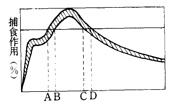 总反应 捕食者的捕食率,在一定的猎物密度范围内呈上升趋势,而超过此范围又逐渐下降,显示了捕食作用对猎物密度呈直接密度制约关系。 理论模型 霍林(1959年)提出过一个通过捕食作用调节猎物密度的理论模型图(图2)。图中用一横线表示作为用以平衡出生率的捕食作用率(X%),而捕食作用的变化系用阴影的死亡曲线的宽度表示。在A和B,C和D这两个密度范围内,死亡率和出生率相等。当猎物密度低于A时,死亡率低于所要平衡的生殖率,则种群密度上升;当猎物密度在B和C之间,死亡率超过出生率,则种群密度将下降。故猎物密度趋向于在A和B附近波动。若猎物种群密度超过D时,死亡率又将低于出生率,则猎物种群数量增加,可出现猎物能逃避捕食者所起的控制作用。这种情况可发生在具高生殖率的猎物种群中。A和D距离越远,这种逃离现象出现的机会越少。