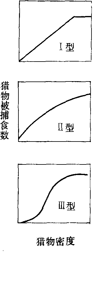 图1 功能反应的3种类型图(仿C.S.Holling) 数值反应 指捕食者数量与猎物密度变化之间的关系,是由食物消耗引起对捕食者生长、生殖、死亡、迁移等方面产生的影响。数值反应也有3类:❶正密度反应,即捕食者密度随猎物密度增加而增加; ❷无密度反应,即捕食者密度不受猎物密度增加的影响,捕食者可转而捕食其他猎物; ❸负密度反应,在猎物密度增加时,捕食者与其他捕食者的竞争导致密度下降,这种数值反应是不稳定的。 猎物密度对捕食者发育速率和生殖率的影响,贝丁顿(J.R. Beddington,(1976)曾提出以下数学模型: 对发育速率的影响