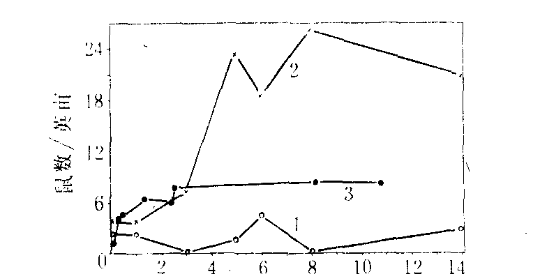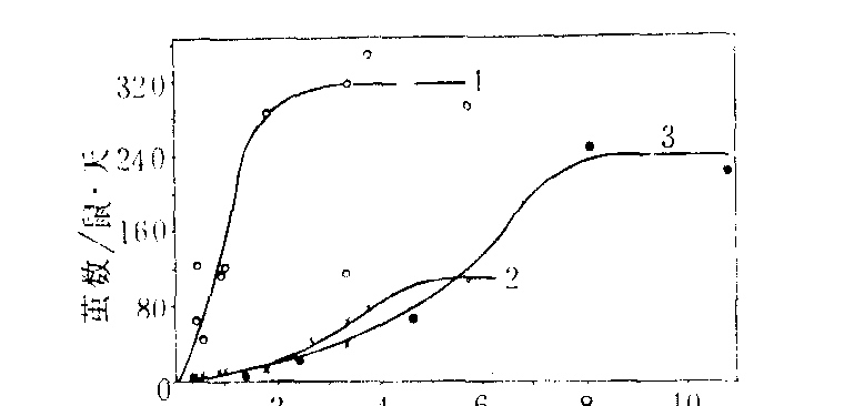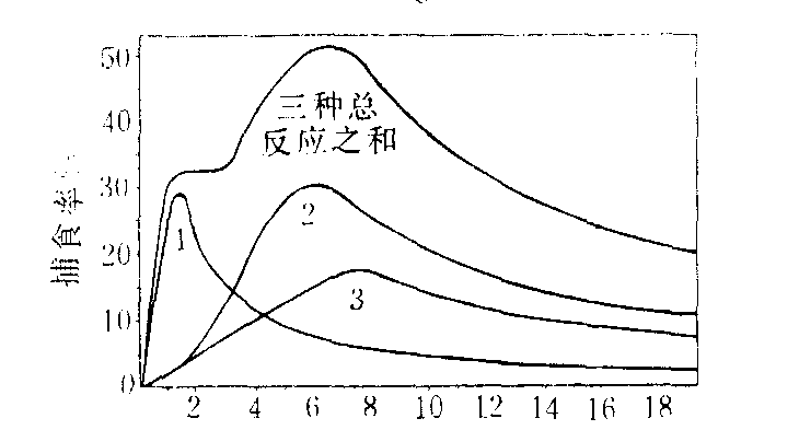 实例分析 霍林在研究小型兽类捕食欧洲松叶蜂的茧时,作了功能反应和数值反应的具体分析(图3)。图3a为功能反应,表示平均每个捕食者消耗猎物的数量变化,是随猎物密度上升而异的。3种捕食者表现不同,鹿鼠Peromyscus为S型功能反应,其余两种在猎物密度达一定程度时,单位时间每头捕食者的捕食量也不再上升。图3b为数值反应,当猎物密度上升时,3种捕食者的密度变化有明显区别:鼩鼱Sorina数量明显地随茧数增多而上升,属于直接反应; 短尾鼩鼱Blarina属于无反应; 而鹿鼠居于两者之间,有时还有逆反应。图3c为总反应,表现为随猎物密度上升而捕食率增大,当猎物密度达一定程度时,捕食率又逐渐下降。