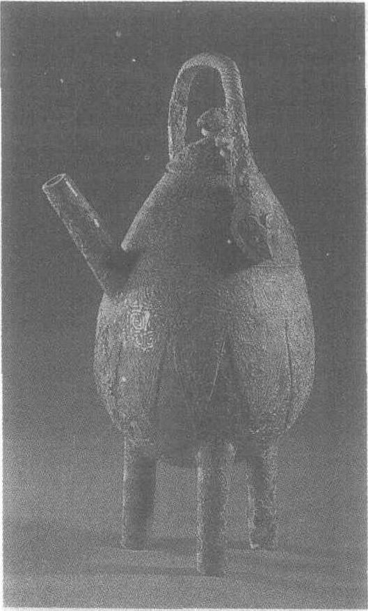 | 释义 | 三足提梁铜盉商。古代盛酒和酒水调和器。通高29.5厘米,口径5.5厘米。重2.3公斤。1976年河南省安阳市殷墟妇好墓出土。河南省博物馆藏。此盉体如竖卵。小口,圆底。口下两侧有环钮,上安蛇头绹索形提梁,有链与盖上的菌状钮相连,以使盖不致脱落。管形长流,圆柱状实足。盖面呈弧形,上饰云纹一周,颈饰夔纹,腹饰雷纹与三角形纹。盉一般多有鋬无梁,此盉无鋬而有梁,造型较异。