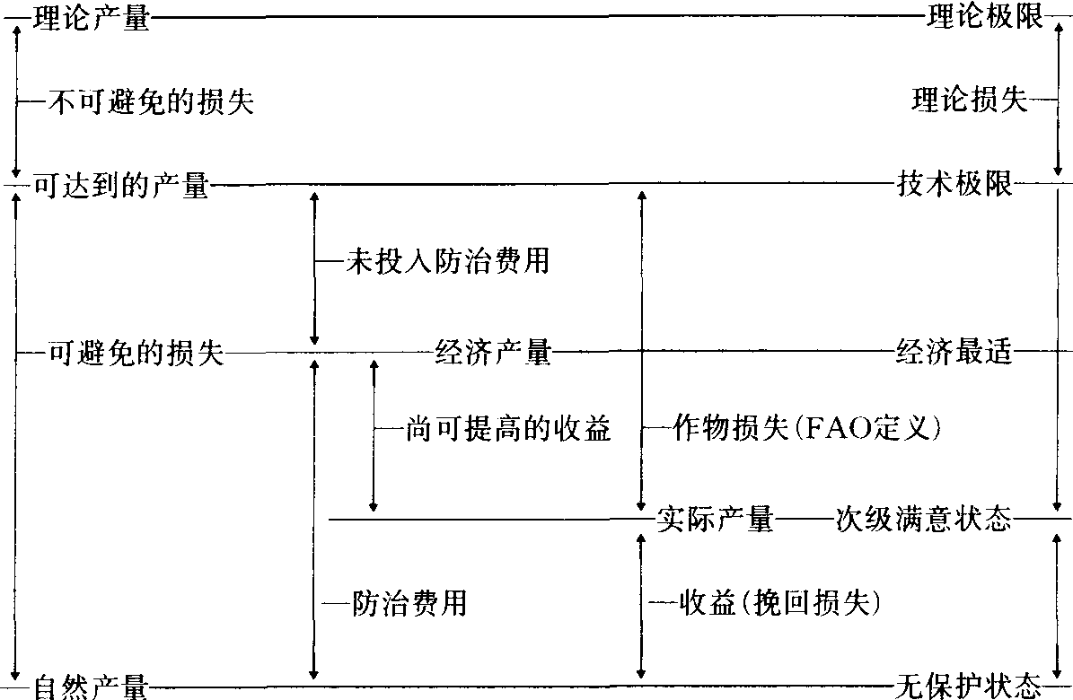 除了上述对损失的“评价”、量化之外,在某种场合则是“推算”、“预测”的意思。它主要研究病害普遍率、严重度与作物损失程度的关系。这种关系大体可分为敏感型、耐害型和超补偿型等三种类型(图2)。敏感型多见于为害期较晚或直接损害结实或收获器官的病害,作物损失与病情之间呈正相关,在二者的直角座标图上形成过原点或接近原点的直线或曲线。耐害型指的是低病情并不导致损失,只有当病害密度大到一定值以后才出现损失。这里,造成作物产量或质量损失的最低有害生物种群密度被称为“作物损失阈值”或“阈值病情”(L.V.Madden,1981)、“病害阈值”(J.C.Zadoks,1979)。出现耐害型的原因是大多数作物都有一定的补偿能力或耐害性。作物补偿能力表现在时间维上中后期生长对前期所受损害的补偿; 空间维上个体不同器官之间或植株不同部位之间的补偿以及群体水平上不同个体之间的补偿。超补偿多见于具有自然的或生理的落花、落叶或落果习性的作物上。少量病害如能加快作物自身调节过程,减少养分损耗,则这种低于作物损失阈值的病害不仅不造成减产,反而增加了产量,这就是超补偿型。在果树、棉花等作物上可以找到很多事例。 损失估计模型 1961年塔默斯(P.M.Tammes)提出产量与逆境因素(stress)之间的理论关系。他强调这种理论关系的特点应该包括作物损失阈值、损失最高限和损失与逆境之间的正相关关系(病情处于作物损失阈值和达到损失最高限之间)。1981年马登(L.V.Madden)根据上述理论,提出一个广适于各种逆境因素的可塑性综合模型: