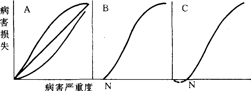 图2 作物损失与病情的关系 A. 敏感型 B. 耐害型 C. 超补偿型 |