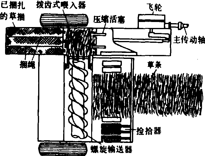 图1 捡拾压捆机工作示意图 捡拾器 为弹性指转筒式,与谷物联合收割机的捡拾器类同(见捡拾装置)。 输送喂入器 用来将牧草送入压捆室,它由螺旋输送器和拨齿式喂入器组成。有的输送喂入器,如双排拨齿式,输送和喂入由同一部件完成。喂入器和压缩活塞作交替运动,应保证牧草的均匀填充,同时退回时不能带草。喂入器退回速度应高于喂入速度。拨齿的工作位置和长度可以调节以适应不同条件。设有超负荷安全器以防牧草量过多时损坏机件。 压缩装置 由压缩活塞和压捆室组成。随活塞的推移,压捆室中每分被压缩干草的密度逐渐增加,活塞的压力也逐渐增大,当压力达到最大值时,克服了后部已压缩干草和壁的摩擦力,整个干草被向后推移一距离,此距离即等于一份干草被压缩至最大密度时的厚度。一个完整的草捆是由若干这样厚度的干草层结合而成。在压捆室内设有止回爪,可避免在活塞返回时干草随着返回。为了在喂饲解捆时各草层能分开,在活塞端部上方和喂入口对应处还安置有切刀。 密度调节装置 其作用是调节压缩室高度向后渐缩的程度,以改变室内干草的摩擦力而改变被压缩干草的最大密度,常见的密度调节装置为弹簧调节式。由于干草含水率的变化将改变其与室壁的摩擦力而使草捆密度发生变化,为此又研制发展了液压调节式密度调节装置,可根据干草含水率的变化实现自动调节。压缩装置是捡拾压捆机上消耗功率最大的部分,曲柄一周内的负荷是不均匀的,因此在曲柄轴上设置一个大的平衡飞轮,使曲柄轴匀速回转。 草捆长度调节器 可使打捆机构及时动作和停止,以保证草捆有一定的长度。当被压缩的草捆逐渐后移时,带动控制轮,使控制杆向上摆动。当控制杆上摆到一定位置时,通过一系列机构使打捆机构结合,从而对草捆进行捆扎。捆扎完毕后又恢复原位置。