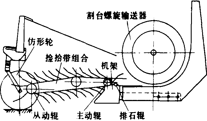图2 弹性指转筒式捡拾装置 弹指带式捡拾装置 结构如图3。仿形轮装在捡拾装置的两侧前方,工作时可使捡拾装置与地面保持调整好的距离。捡拾带组合主要包括主动辊、从动辊、捡拾带、弹指、传动系统等。主动辊用来驱动捡拾带,它的传动有机械和液压两种,新型捡拾装置多用液压马达直接驱动,可无级调节捡拾带的速度。有的捡拾装置为给平直喂入创造条件,采用小直径的主动辊。为防止捡拾带打滑,在主动和被动辊之间增加链传动。捡拾带组合分两辊和三辊式两种。三辊式除主、从动辊外,中间还装一支承辊,使捡拾带后部呈平直状态,避免作物架在螺旋输送器上,造成不均匀喂入。从动辊直径应尽量小,以降低前端弹指与地面的距离,有利于捡拾稀疏条铺,减少漏捡损失。弹指用尼龙制造,弹性好,特别适于豆类作物的捡拾。弹指在捡拾带上一般呈螺线排列,捡拾覆盖面大,很少有漏捡现象。弹指带式捡拾装置除配装在谷物割台上外,大多设计成专用捡拾台,采用快速挂结方式,使用更换很方便。它适于与大型高效谷物联合收割机配套,捡拾性能比上述两种型式为好,但价格昂贵。